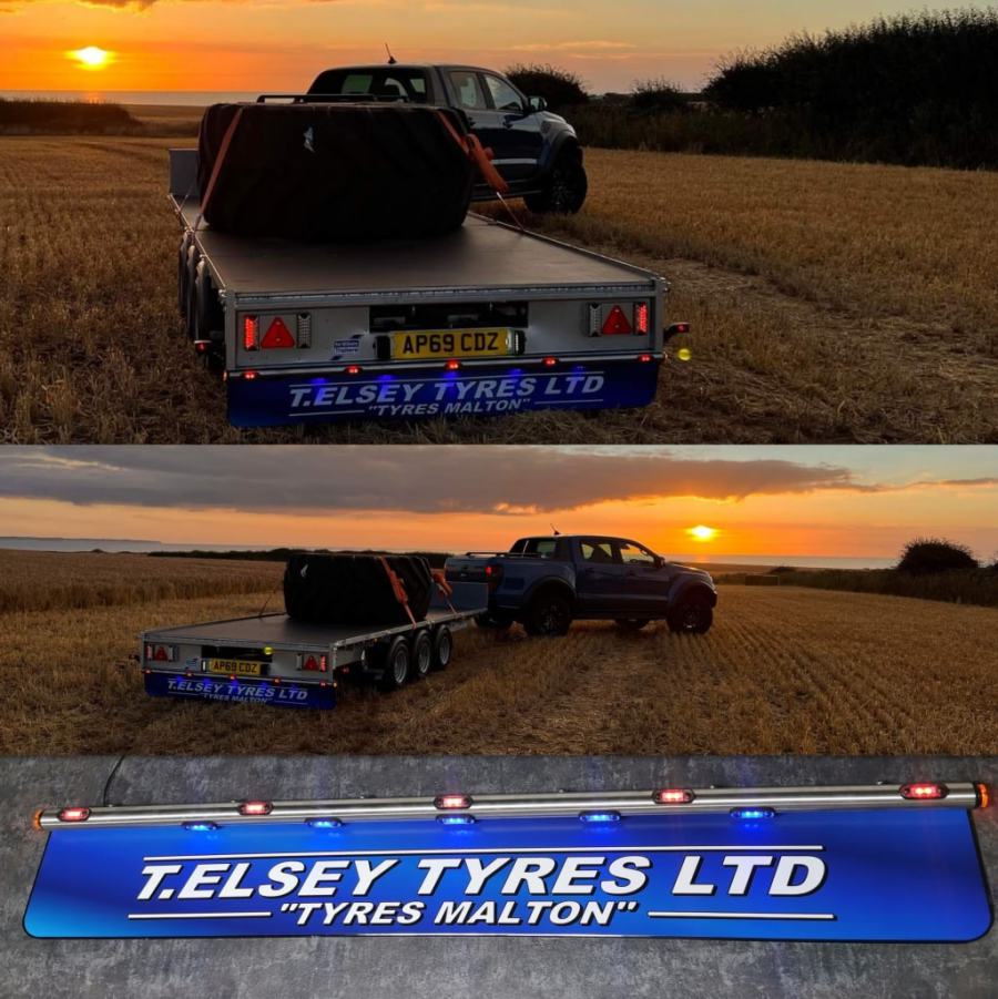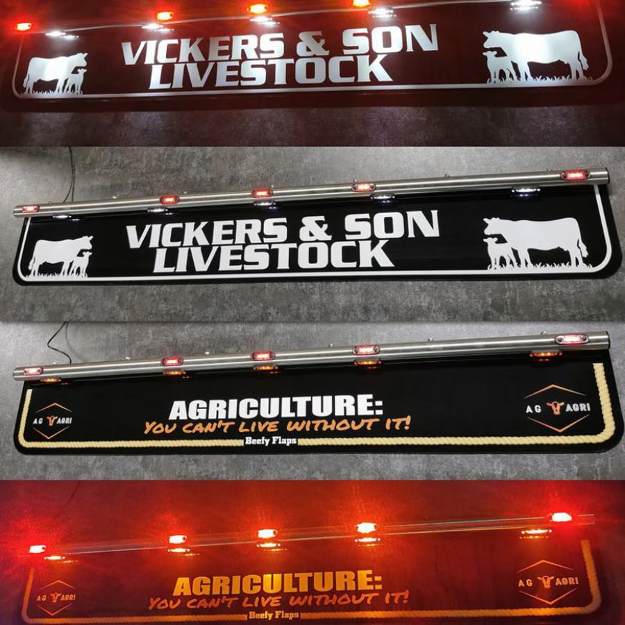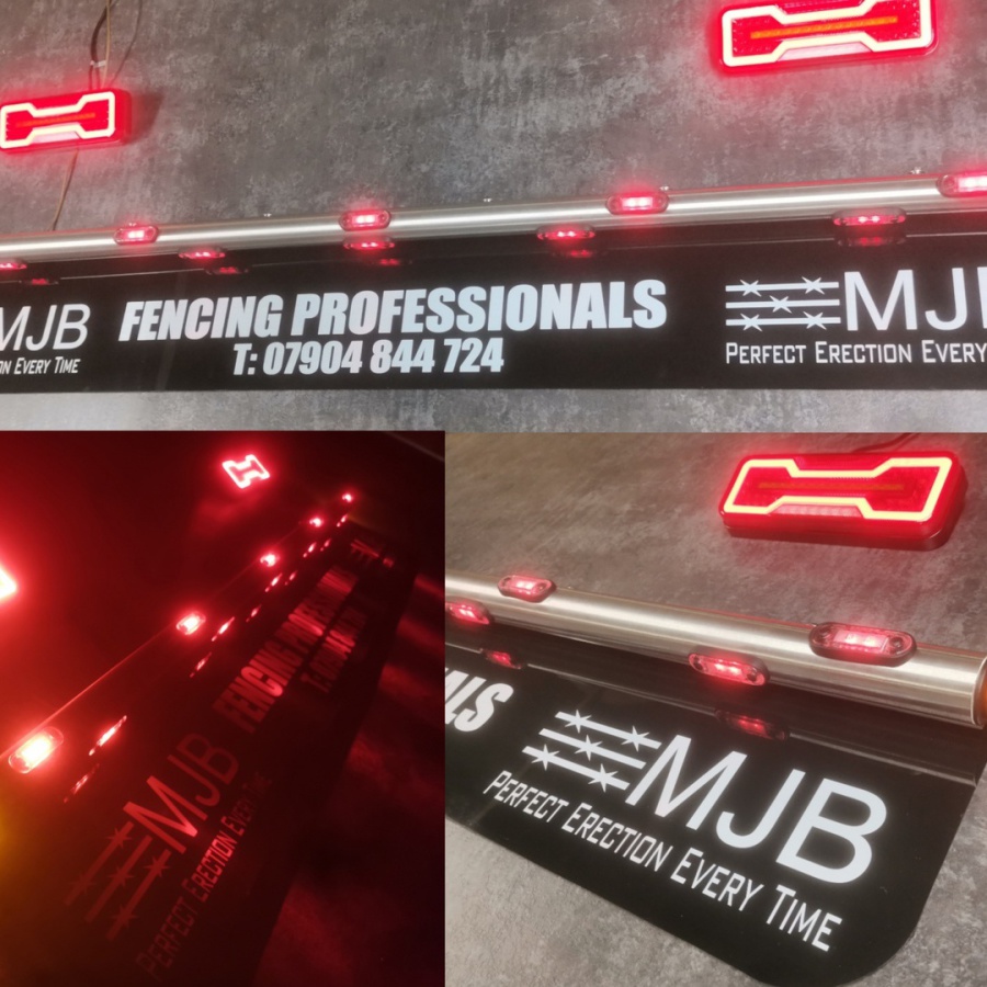 We fabricate the stainless steel trailer light bars. This comes complete with red rear facing lights, down lights to illuminate the flap in a choice of colours, along wih the flap fitting kit to the rear of the bar.